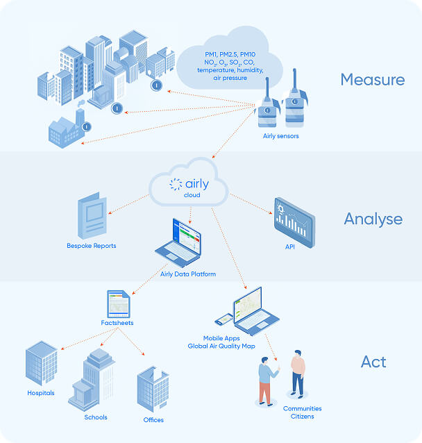 Airly delivers a complete end-to-end air quality intelligence solution for cities, local authorities, businesses and organisations that want to take control of their environmental impact. Our approach is based on a clear principle: Measure the air quality. Analyse the data. Act on the insights.