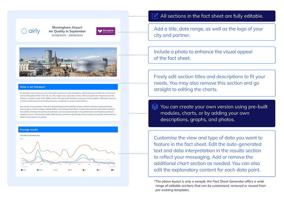 Airly Factsheets are your automated bridge between complex air quality data and meaningful community impact. Designed for local authorities, businesses and institutions, they translate real-time and historical pollution data into easy-to-understand, branded reports that inform, educate and build public trust.